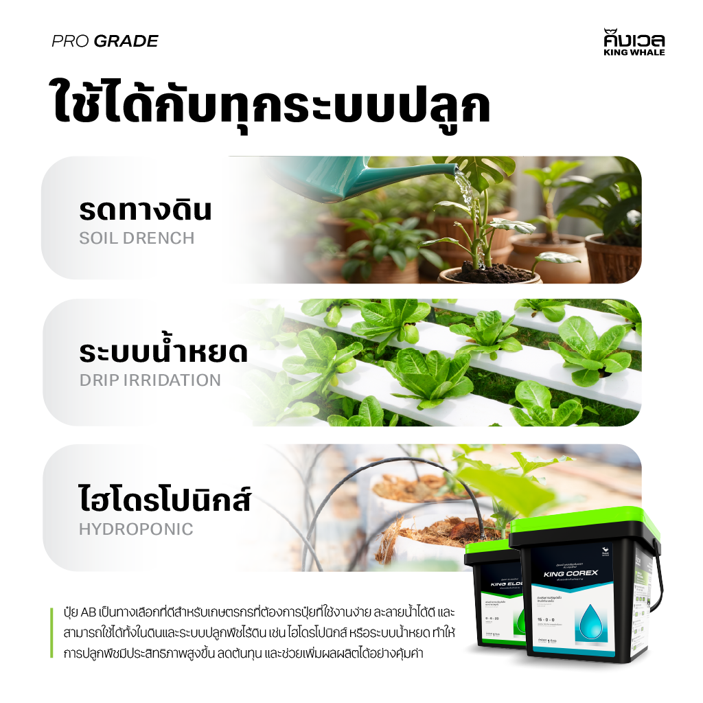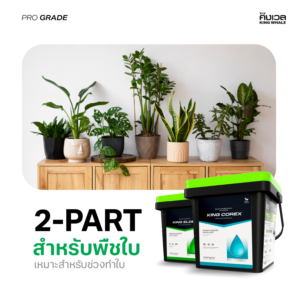 ปุ๋ย King Whale เซ็ท AB สำหรับพืชใบและระยะทำใบ ด้วยธาตุอาหาร NPK อย่างครบถ้วนและสมดุล ช่วยเร่งการเจริญเติบโต สร้างลำต้น เร่งราก ช่วยให้ต้นไม้ดูดซึมสารอาหารเจริญเติบโตได้อย่างสมบูรณ์แบบตลอดเวลา และ ไม่ต้องคอยกังวลเรื่อง pH สวิงด้วยเทคโนยี pH perfect ทำให้ pH คงที่นานกว่า 31วัน จึงทำให้ไม่ต้องคอยปรับ pH บ่อยๆ หมดกังวลจุดนี้ไปได้เลย