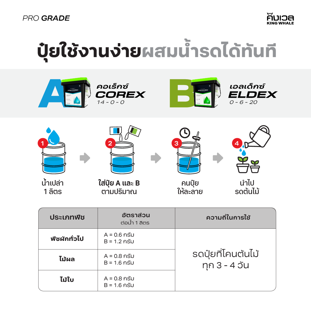 – ผสม CoreX 0.5-0.6กรัม + EldeX 1-1.2กรัม ต่อน้ำ 1ลิตร เหมาะสำหรับผักไทย ผักสลัด
