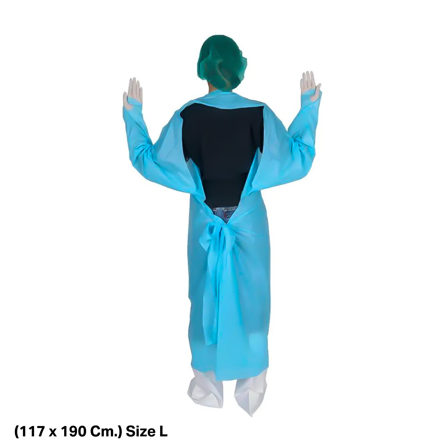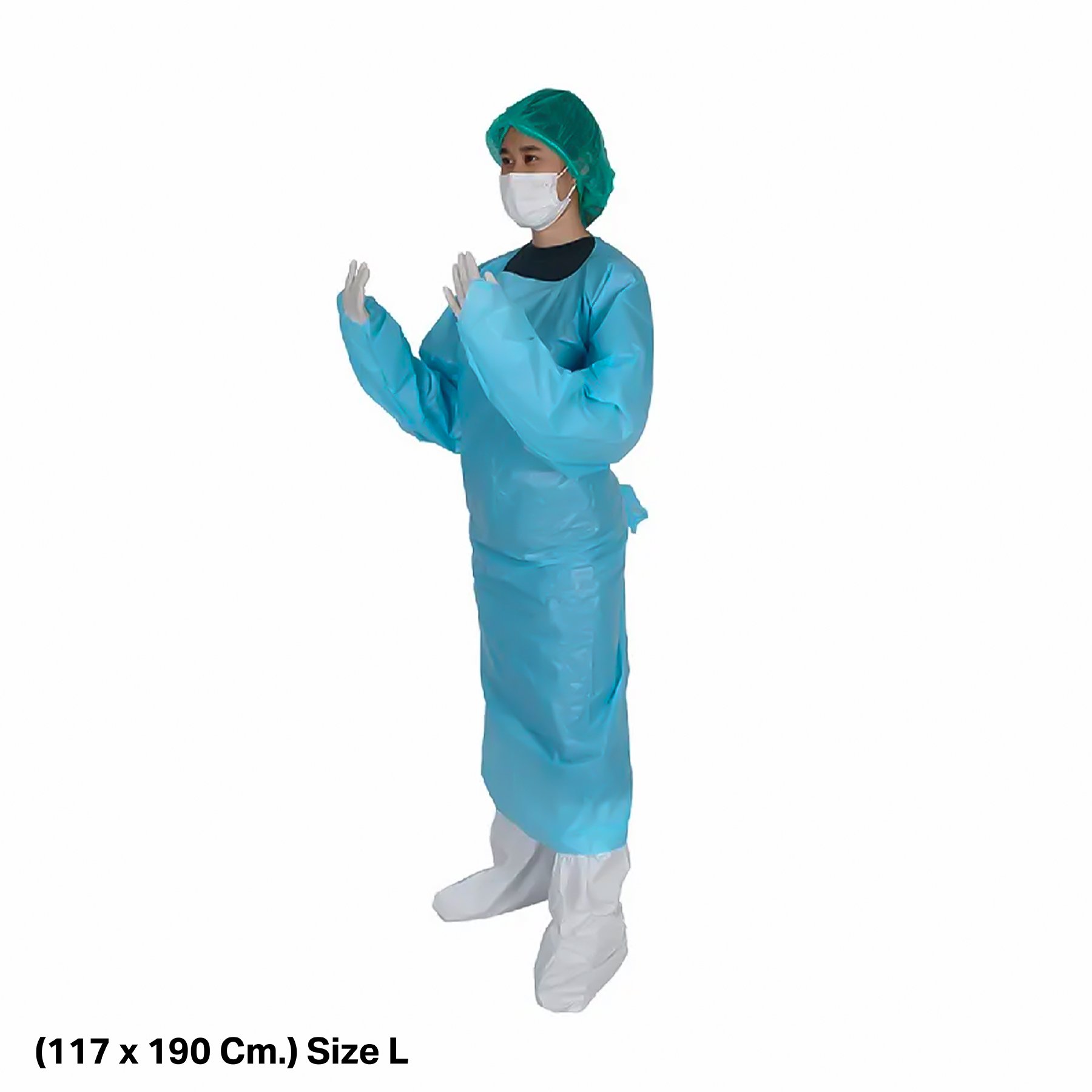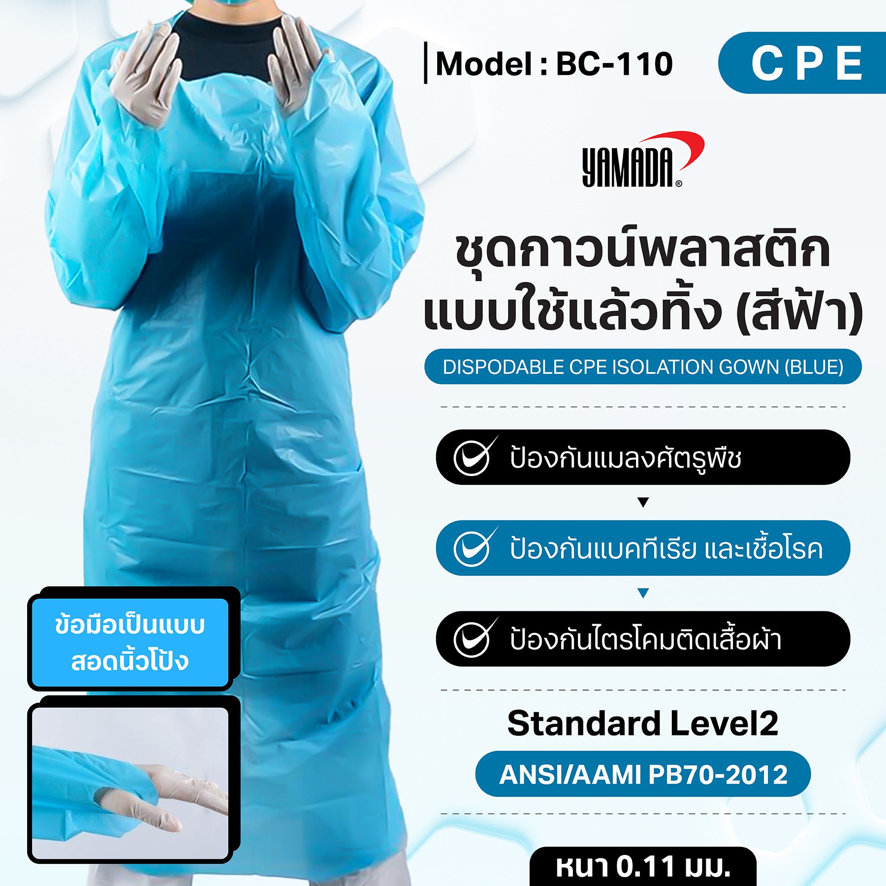 CPE Gown Yamada ชุดกาวน์พลาสติกใช้แล้วทิ้ง แบบคลุมครึ่งตัว ปิดด้านหน้าผูกเอวจากด้านหลัง พร้อมข้อมือแบบสอดนิ้วโป้ง