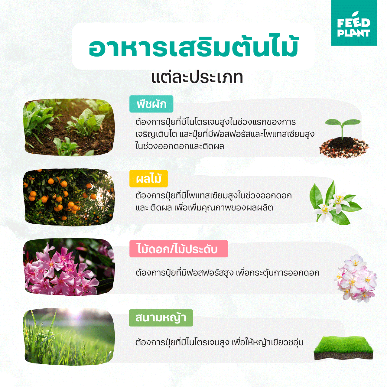 1. FEED PLANT สูตร All Plants : บำรุงต้นไม้ให้แข็งแรง, ส่งเสริมการเจริญเติบโต, เพิ่มประสิทธิภาพการดูดซึมธาตุอาหาร ใช้ได้กับ พืชทุกประเภท (ไม้ใบ, ไม้ดอก, ไม้ผล, พืชผักสวนครัว)