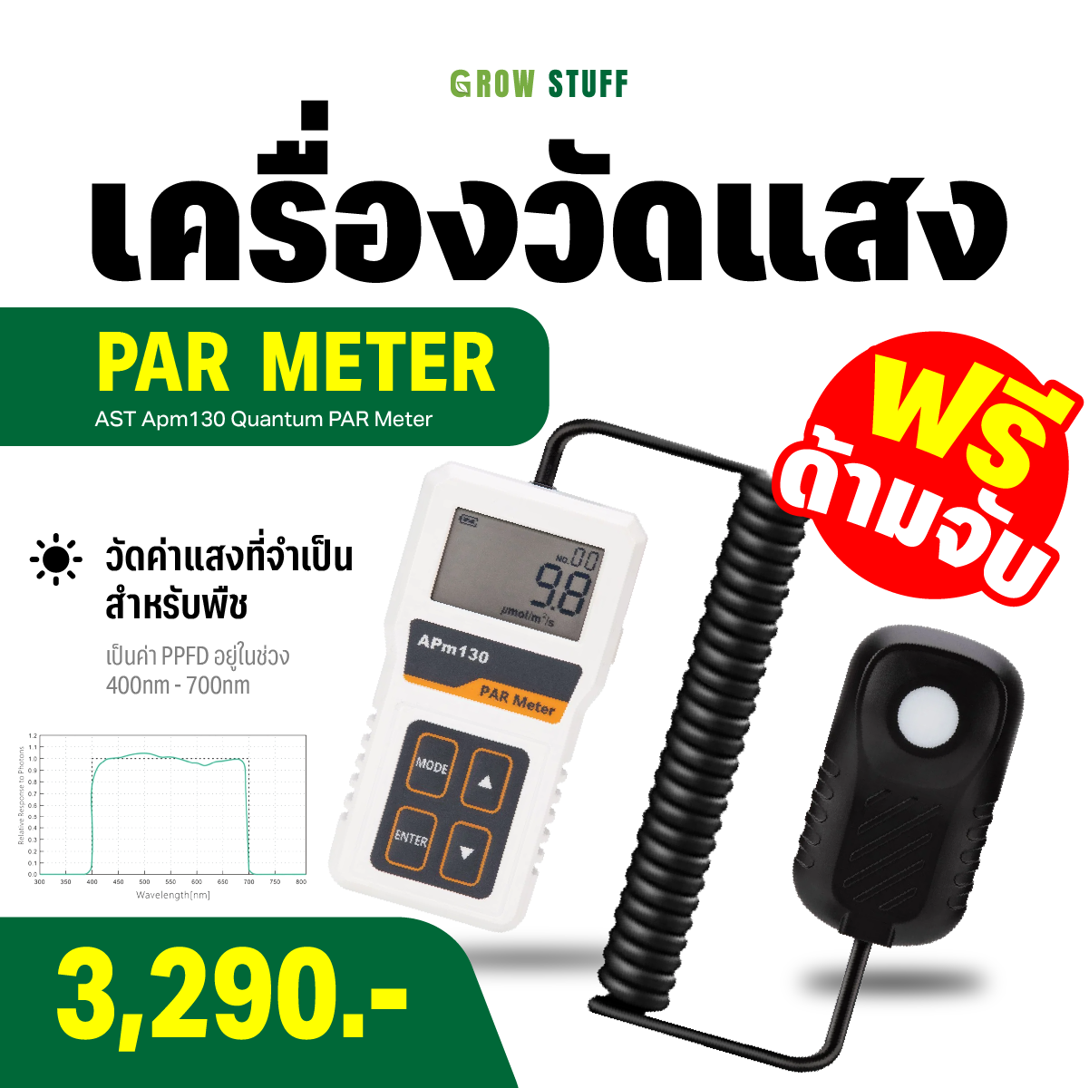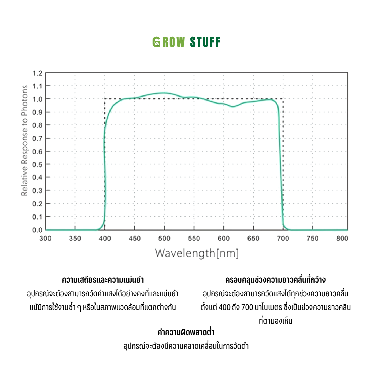 ✅ ค่า PPFD คือค่าแสงที่พืชใช้ในการสังเคราะห์แสง ช่วงความยาวคลื่นที่วัดได้ตั้งแต่ 400 ถึง 700 นาโนเมตร
