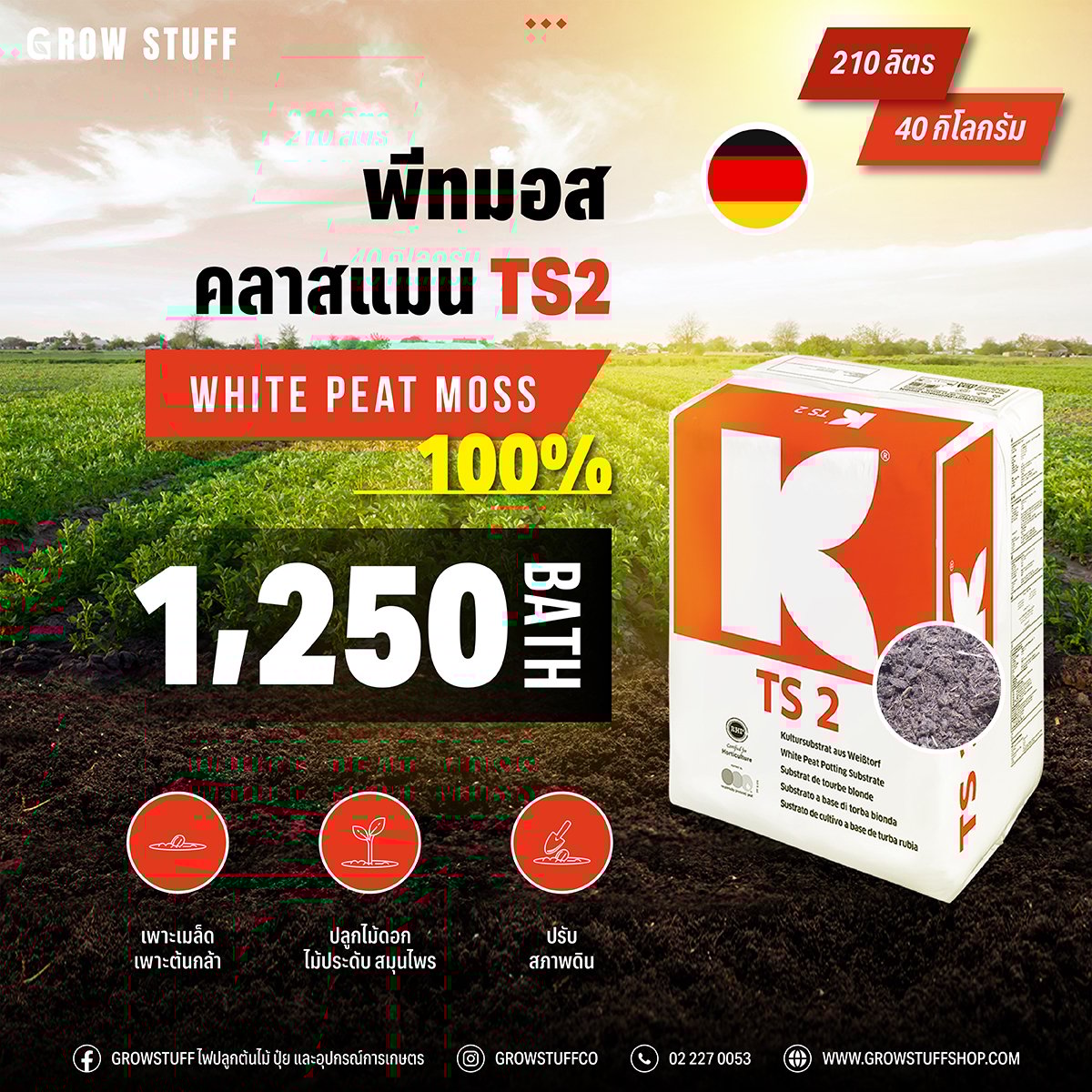 พีทมอส คลาสแมน TS 2 White Peat Moss 100% 210 ลิตร 40 กิโลกรัม เพาะเมล็ด-ต้นกล้า ปรับสภาพดิน ปลูกไม้ดอก ไม้ประดับ สมุนไพร สะอาด ปลอดภัย ไร้สารตกค้าง ต่างจากดินปลูกทั่วไป ปราศจากวัชพืช เชื้อโรค แมลง และสิ่งเจือปนต่างๆ มีส่วนประกอบหลักเป็นพีทขาวเนื้อละเอียดเส้นใยสั้น ระบายน้ำได้ดี น้ำไม่ขัง มีสารอาหารน้อยเหมาะแก่การปลูกพืชที่ต้องควบคุมปุ๋ย ช่วยทำให้รากพืชเจริญเติบโตได้ดี และมีความแข็งแรง มีอัตราการงอกในการเพาะเมล็ดสูงถึง 99% มาตรฐาน ISO 9001 มาตรฐาน R.H.P. (ไม้ดอกฮอลแลนด์) มาตรฐาน RAL (มาตรฐานเยอรมัน)