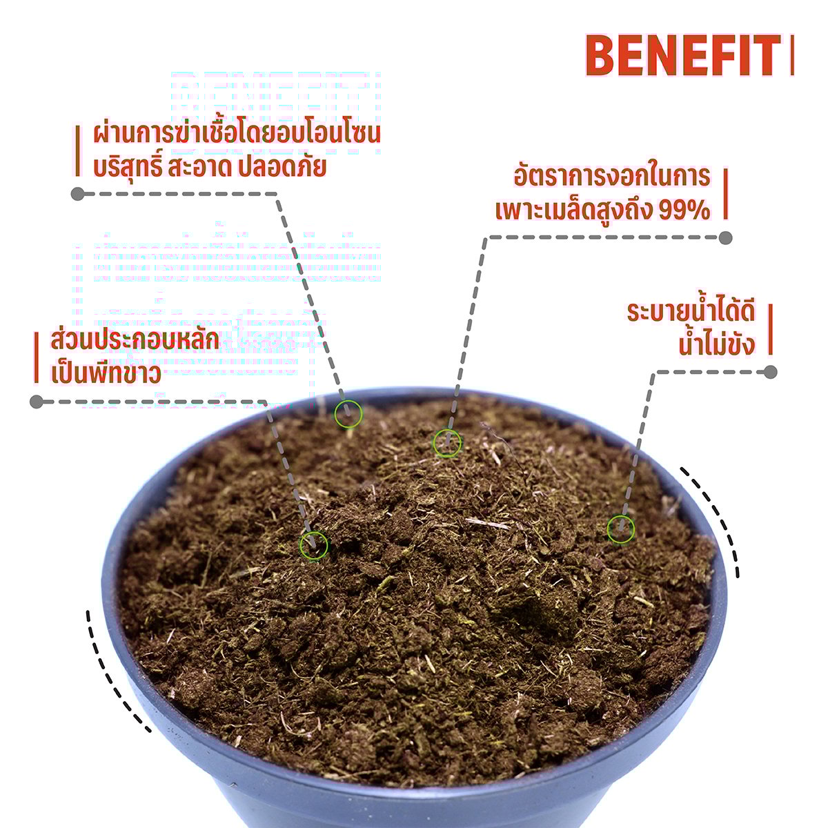 วัสดุปลูกเกรดพรีเมี่ยมพร้อมใช้งาน ช่วยให้การปลูกต้นไม้ของคุณง่ายและสะดวกมากขึ้น เหมาะกับการปลูกพืชทุกชนิดทั้งในระดับงานอดิเรกจนถึงเพื่อเพิ่มผลผลิตทางการเษตร เป็นหนึ่งเรื่องการกักเก็บความชื้นและถ่ายเทอากาศซึ่งเป็นหัวใจของการปลูก  หมดปัญหาแบคทีเรียและเชื้อรากวนใจที่อาจทำอันตรายต่อต้นไม้ที่คุณรัก